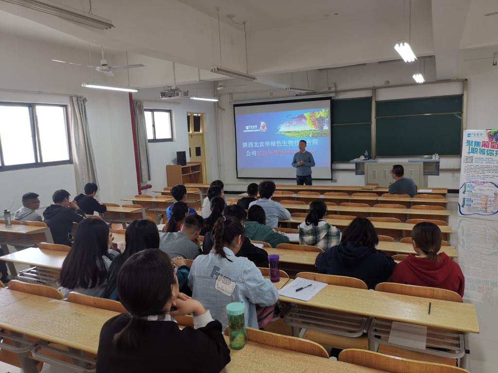 11月6日,陕西北农华绿色生物技术有限公司人力资源总经理刘涛一行三人在1223教室举行2021届校园招聘会。2021届园林、农学、茶学、食品科学与工程专业部分毕业生参加了招聘宣讲活动,辅导员金清民主持。