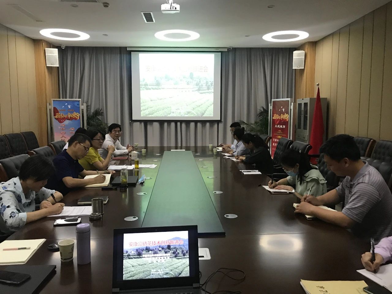 5月20日,由中国农业科学院茶叶研究所、中国富硒产业研究院、澳门pg官方电子平台联合举办的安康富硒茶技术创新推进会在安康市富硒产品研发中心(中国富硒产业研究院)召开。中国农业科学院茶叶研究所、中国富硒产业研究院富硒茶叶栽培与产品开发创新团队执行专家曾建明研究员、紫阳焕古茶叶公司负责人刘小军、安康市富硒产品研发中心、农业农村部富硒产品开发与质量控制重点实验室全体人员参加了此次工作推进会。澳门pg官方电子平台农生院副院长王健教授,澳门pg官方电子平台纪昌中副教授、李冬花博士以及齐玉岗等茶学专业教师参加会议。