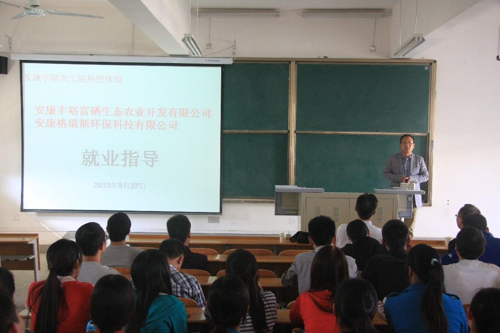 为拓宽就业渠道,进一步开辟新的就业市场,努力提高毕业生就业专业对口率,促进就业质量稳步提升,确保2014届毕业生就业质量再上新台阶。9月27日,经澳门pg联系,安康丰裕富硒生态农业开发有限公司、陕西安康格瑞斯环保科技有限公司总经理潘波、企业法人李忠斌一行三人来到澳门pg,对10级农学、11级农学、11级环境规划与管理专业学生进行了就业指导和专场招聘。