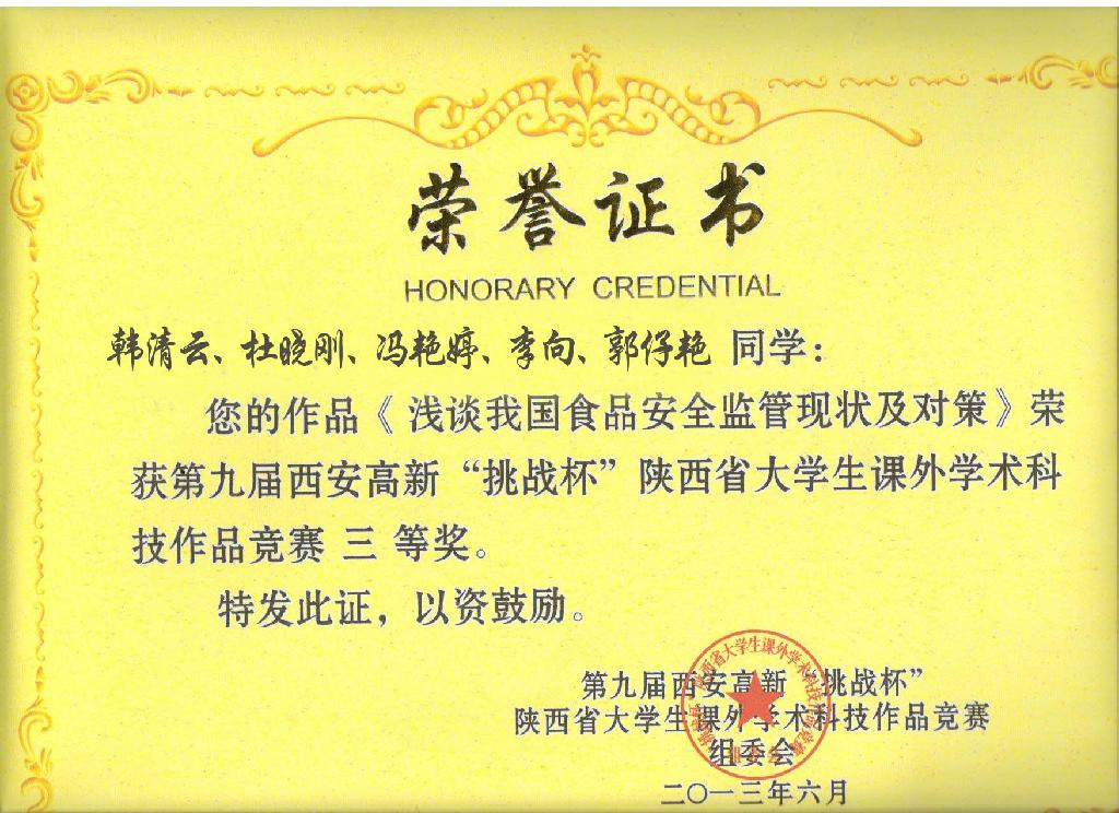 日前,2013年第九届西安高新“挑战杯”陕西省大学生课外学术科技作品竞赛评审结果揭晓,由澳门pg朱新鹏、杨薇老师指导的作品《浅谈我国食品安全监管现状及对策》(参赛学生11级韩清云、杜晓刚、冯艳婷、李向、郭仔艳)获得省级三等奖。