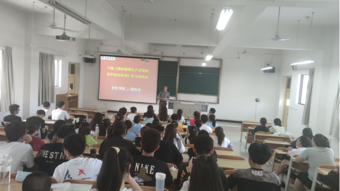 6月8日,澳门pg园林系在江北校区1215教室召开了2019级《园林植物生产及绿地养护综合实训》实习动员会,实习指导老师袁海龙、沈大刚和张海军参加会议。
