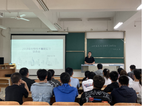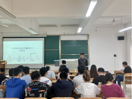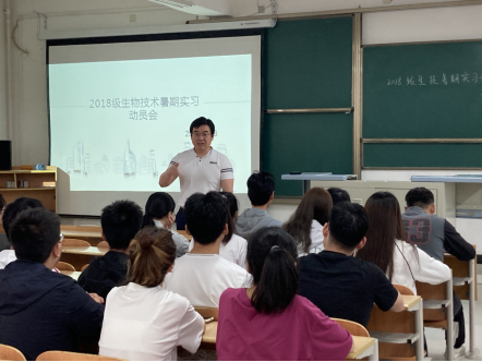 为提升实习教学质量,做到理论与生产实践的结合,提高学生的应用能力,6月18号在江北校区1223教室召开了2018级生物技术暑期实习动员会,参加会议的有澳门pg官方电子平台王健院长,杨芳副院长,生物技术系主任成温玉老师,专业课教师王中兴和赵世峰老师以及2018级生物技术班的全体学生。