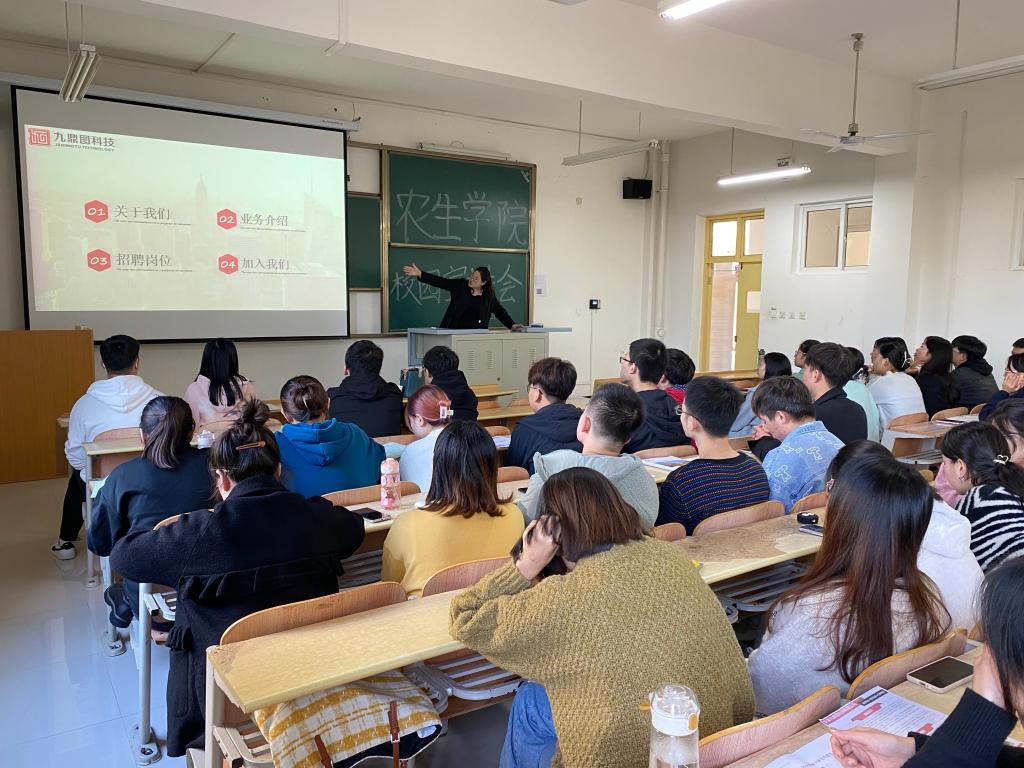 10月18日下午,安康九鼎图科技有限公司在1108教室召开校园宣讲会,澳门pg官方电子平台辅导员张伟艺及园林专业70余名毕业生参加了本次会议。宣讲会由该公司乔福磊经理主讲。
