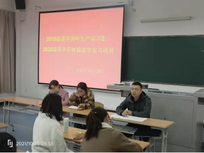 2021年10月25日上午,茶学专业2019级和2020级召开了实习动员会,茶学专业2019级和2020级全体学生和茶学系系主任李冬花、实习带队教师齐玉岗、马瑛老师参加会议。