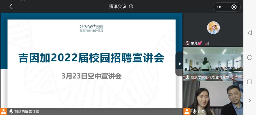 3月23日下午,北京吉因加科技有限公司利用腾讯会议举办澳门pg官方电子平台专场线上招聘宣讲会,澳门pg80余名毕业生参会,会议由公司人事专员刘益、临床事业部总监常连鹏主讲。