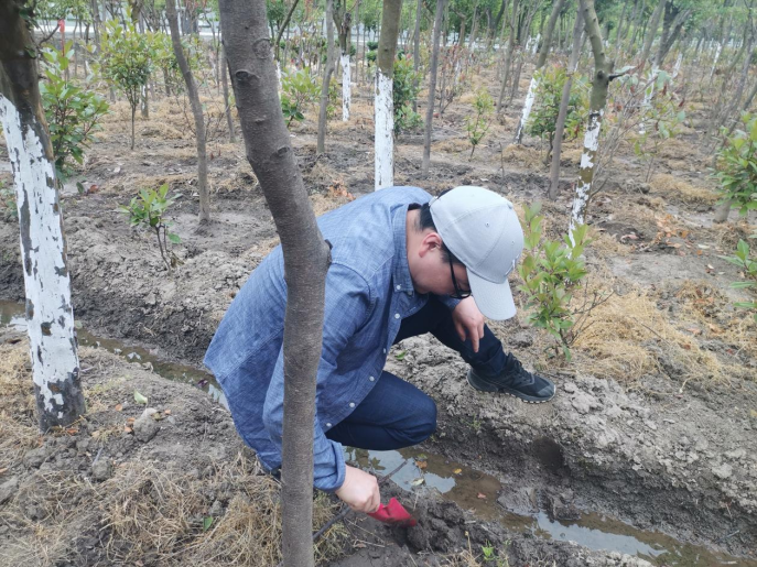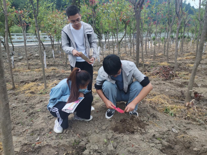 师生一行来到小塘村木瓜园区,在园区内分别对木瓜锈病菌、富硒区内的蚯蚓和土样进行采集。