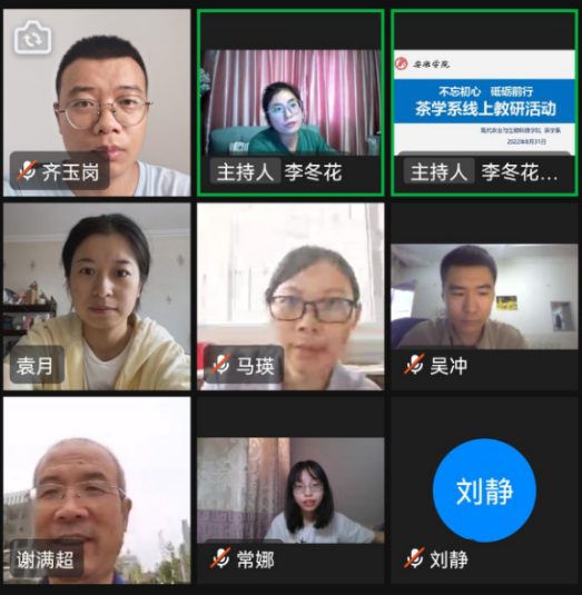 为进一步保障疫情期间课堂教学效果,提高线上教学质量,确保学生线上学习效果,澳门pg茶学系于8月31日开展线上教学研讨会,围绕线上教学出现的问题及经验、作业布置设计等方面展开教学研讨。本次会议由茶学系主任李冬花主持,茶学教师齐玉岗、吴冲、谢满超、马瑛、袁月、常娜、刘静等教师参会。