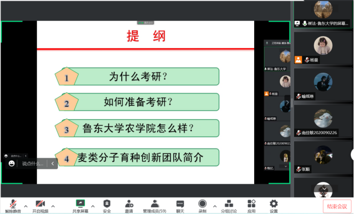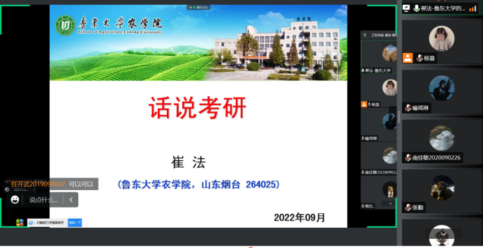 9月22日、23日,陕西理工大学生物科学与工程学院副院长张辰露教授、鲁东大学农学院副院长崔法教授分别受邀在线上围绕考研规划、考研准备、目标选择、团队介绍等内容进行精彩讲授,并就同学们关注较高的如何准备英语复试、何时联系导师、如何选择研究方向等问题进行释疑解惑。两场宣讲活动内容详实、针对性强,两位教授宣讲语言生活活泼、贴近学生,在临近报名之时为澳门pg学生科学选择目标、合理规划未来下了一场“及时雨”。