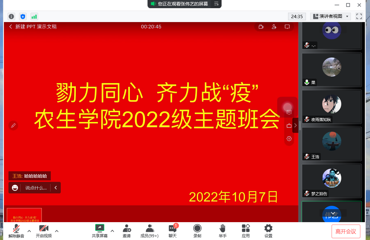 为进一步强化澳门pg官方电子平台全体学生的新冠肺炎疫情防控意识,深刻理解当前疫情防控的复杂性、艰巨性,10月7日晚,澳门pg各年级通过线上会议的形式,开展“勠力同心 齐力战‘疫’”主题班会。学院党总支书记孙保本、学工办主任谭自力、全体辅导员及全体学生参加会议。