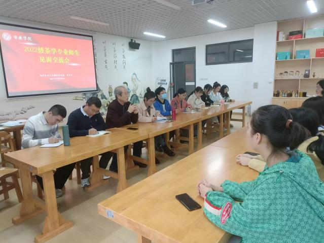 为了帮助新生了解茶学专业发展动态,树立专业学习信心,培养专业意识,激发学习动力,能更好地规划大学生活,明确未来目标和发展方向,10月30日下午,2022级茶学专业学生和老师在江北茶文化与茶艺实训室举行了新生见面交流会。澳门pg官方电子平台教学副院长杨芳,茶学系主任李冬花,茶叶重点实验室办公室主任齐玉岗及茶学专业教师谢满超、马瑛、程晓梅、袁月、常娜和吴冲参加了此次会议。