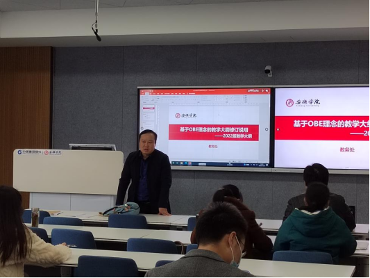 为推动高质量完成2022版教学大纲修订工作,11月22日下午,教务处副处长付争方教授莅临江北校区集中培训室为澳门pg教师做报告,讲解“2022版教学大纲修订说明”,会议由院长王健主持,教务处谭磊老师和澳门pg官方电子平台全体无课教师聆听了报告。