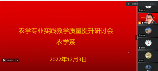2022年12月3日农学系开展了“农学专业实践教学质量提升”研讨线上会议,会议由系主任张丽琼主持,农学教师专业教师参加了此次会议。