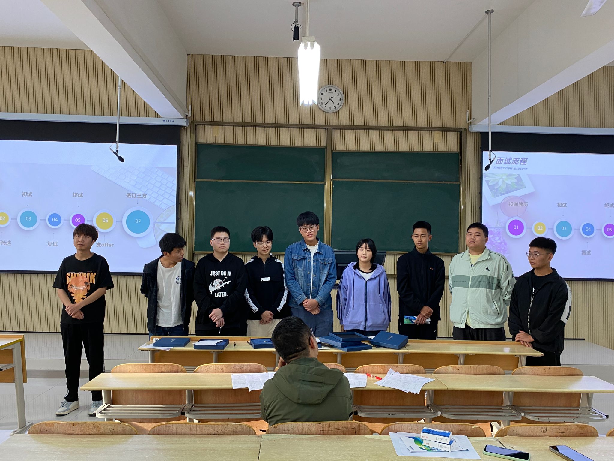 孙欢介绍了公司基本情况,就招聘岗位、薪酬福利、晋升空间、学习培训等方面与同学们做了交流,会上通过现场投递简历,经过面试,有7人签约。