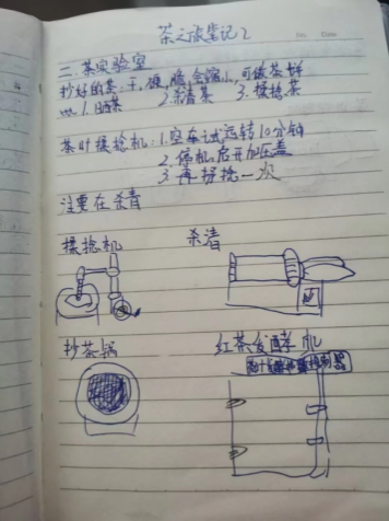 在茶园吴冲和程晓梅老师为队员们讲解了茶树的形态、种植栽培及茶叶采摘的相关知识。在茶叶加工实验室,吴冲老师介绍了各种茶的加工流程,并讲解了各种加工机器的用途。