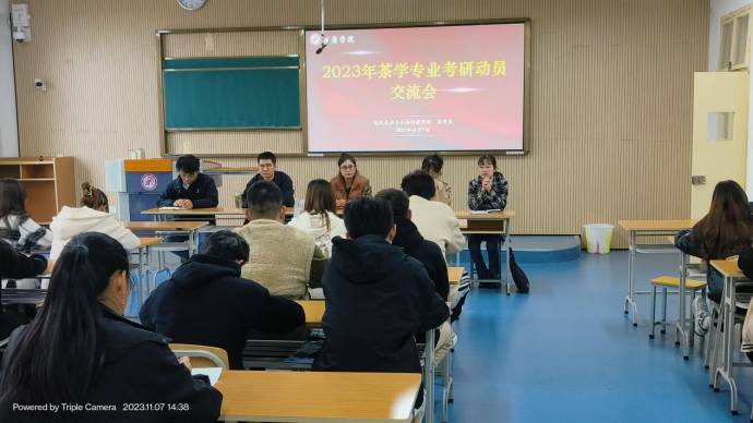 为进一步提高茶学专业学生考研积极性,增强考研信心,提升考研竞争力,推动茶学专业高质量人才的培养,茶学系于2023年11月7日下午,在江北校区1号教学楼1501教室召开了2023年考研动员交流会。茶学系专业教师李冬花、吴冲、程晓梅、常娜、尹旭超及2022级、2021级全体茶学学生参加了会议,会议由系主任李冬花主持。
