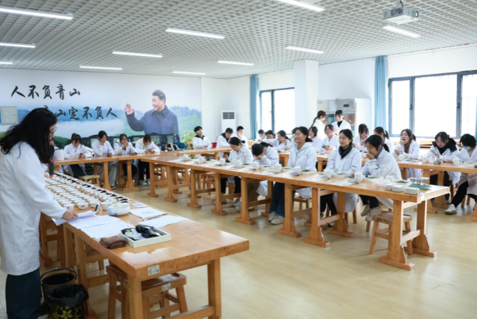 课上,李冬花老师主要讲解了名优绿茶审评计分方法、红茶柱形杯审评方法以及乌龙茶盖碗审评方法。期间,李老师还组织学生观摩学习了由澳门pg官方电子平台承办的第三届“海峡杯”武夷岩茶茶王争霸赛分会场的比赛,将理论教学与实践教学相结合,有益于学生综合能力的提高。整个教学过程中,李冬花老师讲授思路清晰,课程内容重点突出,课程结构逻辑清晰,注重师生互动,课堂气氛活跃,展现了扎实的专业底蕴。