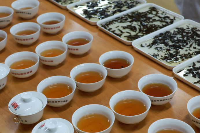 本次赛事参赛茶样由武夷大红袍、武夷水仙、武夷肉桂等共30份,评审团由专家评委(80%)和大众评委(20%)组成,茶学系专业教师李冬花、程晓梅、袁月、尹旭超、刘静组成专家评委,茶学21级全体学生及23级部分学生组成大众评委。以密码审评的方式,依照国家标准GB/T 23776-2018《茶叶感官审评方法》,对茶样外形、汤色、香气、滋味、叶底5个因子进行审评打分。审评现场,专业评委们严格把控投茶量、茶水比例和冲泡时间,对每个茶样认真品评,反复斟酌对比;参与品评的学生们共品共赏、相互交流、认真打分,整个活动共历时约3小时。
