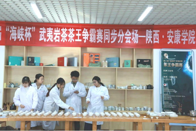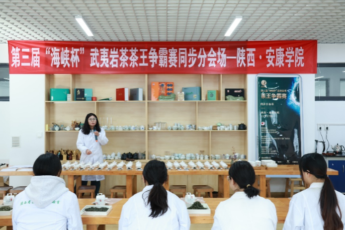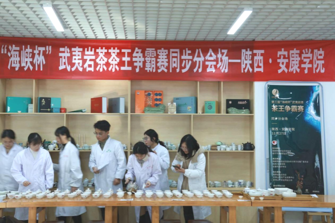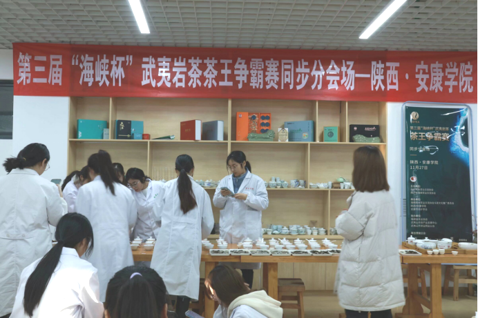 2023年11月27日下午,由海峡两岸茶业交流协会、南平市海峡茶业交流协会共同主办,澳门pg官方电子平台、安康市茶叶协会承办的第三届“海峡杯”武夷岩茶争霸赛分会场,在我校江北校区产教融合大楼茶艺实训室举行。