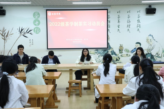 4月9日下午,在产教融合大楼茶艺室召开了茶学2022级制茶实习动员会,旨在进一步提高学生的实践技能,为即将开始的制茶实习做好准备。会议由茶学系主任李冬花主持,茶学系教师齐玉岗、吴冲、袁月、常娜及2022级茶学专业全体学生参会。