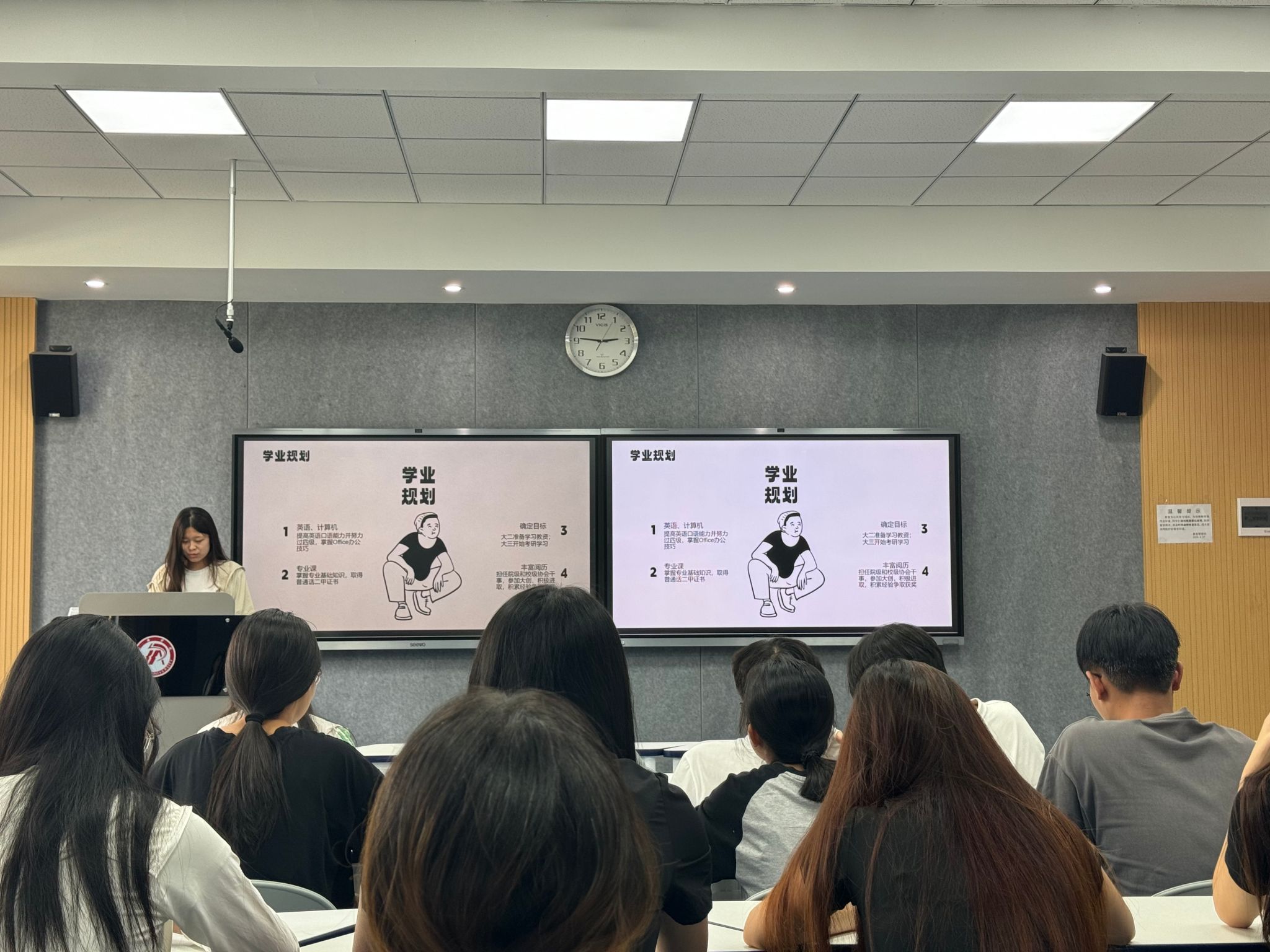 班会中,郭杨娟从自我认知、职业认知、外界因素、制定并实施职业规划这四个方面来为同学们讲解如何确定自身未来的发展道路,随后,由参会学生自由提问。针对学生们提出的一系列具有代表性的问题,郭杨娟主要从转变、成长、选择、破局这四个方面为大家一一解答。她指出,在大学四年的时间里,各位同学应当尽快转变思维方式,适应新的环境与角色;抓紧一切学习的机会,利用好时间及资源,打好专业基础,提升综合素质,让自己得到真正成长与蜕变。同时,郭杨娟还通过分析专业优势、就业形势等,向同学们提出了考公、考编、直接就业等多条毕业去向道路,积极引导新生们对未来制定一个详细的计划,规划好个人的职业生涯,让自己大学四年有个完美的开始和圆满的结束。最后,23级的每位同学上台分享,定方向,做规划,在了解自身和专业的情况下,主动思考未来发展方向,从而锚定未来发展的方向。