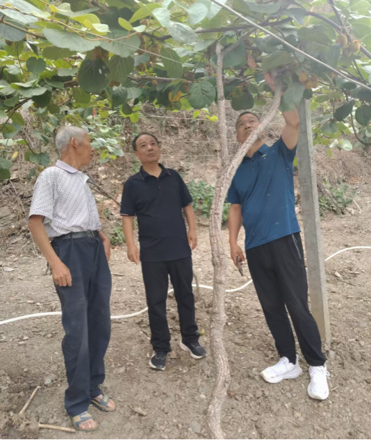 沈大刚和纪宏耀老师深入猕猴桃园对今年旱情对猕猴桃的影响、猕猴桃果实生长、病虫害情况进行调查,并对如何疏果、水肥管理、优树筛选等技术进行现场指导。