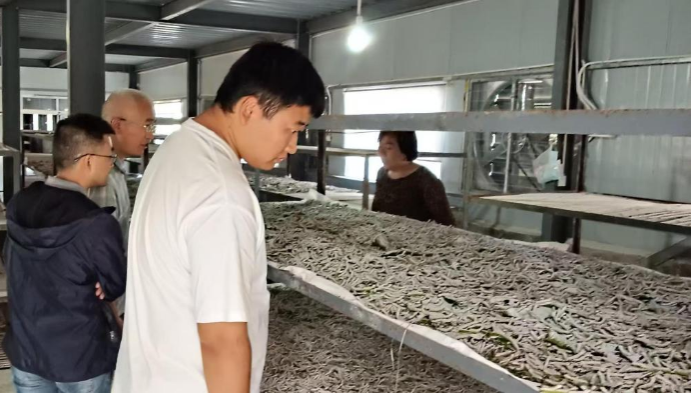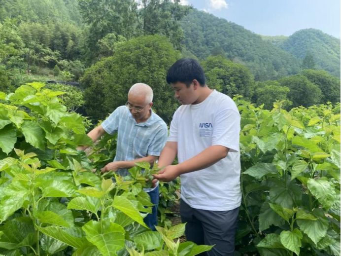 彭云武、孟刚和张笙源在蚕棚与蚕农交流养蚕技术,建议蚕农注意大蚕期的通风,加强每天的蚕体消毒防病;针对采摘桑叶困难,提出多批次养蚕和加强桑园梳芽、施肥工作。