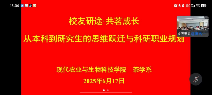为加强校友与在校生的交流互动,发挥优秀校友的榜样引领作用,助力茶学专业学子明确学习方向与职业规划,6月17日下午,茶学系在乡村振兴学院二楼成功举办《校友研途·共茗成长——从本科到研究生的思维跃迁与科研职业规划》专题交流活动。本次活动邀请2022届、2023届茶学专业优秀毕业生代表分享,通过线上线下相结合的方式进行交流。茶学专业教师及2022-2024级茶学全体学生共同参与,活动由齐玉岗老师主持,信息化建设与管理中心何飞老师为线上交流提供了技术支持。