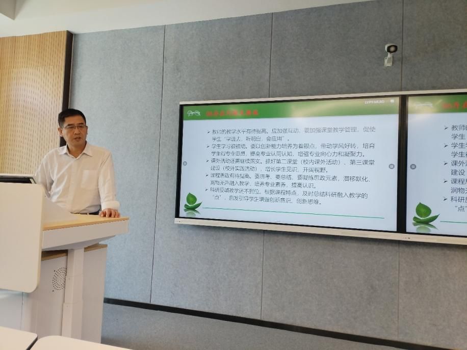 专业负责人朱新鹏教授,不仅分享了自己的在所授课程方面的思考,还分享了他作为学校教学督导,发现的普遍性问题,提醒我们专业教师对照反思。比如针对我们学生的学习特点和学校办学定位,在教学过程中,尽量避免过多的篇幅放在理论讲述,朱老师认为以培养应用能力为主,避免枯燥的理论讲述,以应用为突破口,降低学生畏难情绪,激发学生学习热情。思政教育融入课程要润物细无声,太刻意反而不能达到目标。