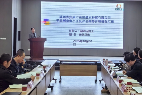 2025年10月29-30日,陕西省动物疫病预防控制中心副主任胡晗、科长冉红志、王香敏等陕西省动物卫生风险评估专家组一行对陕西省安康市秦阳晨原种猪有限公司“国家级无非洲猪瘟小区”复评估维持管理情况进行现场评审,安康市畜牧兽医中心副主任王黎明、汉滨区农业农村局副局长罗晓琴等市区领导陪同检查。澳门pg赵鸿远博士代表企业负责整个检查工作的汇报和现场答辩环节。