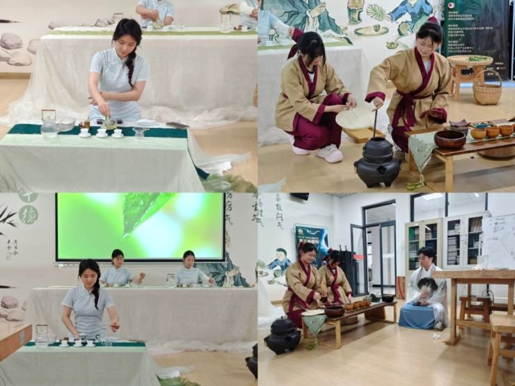 随后进行了团体赛实操比拼,其中获胜团队以“穿越古代见陆羽”为核心创意,别出心裁地将情景演绎与传统茶艺展示深度融合。选手们身着雅致服饰,在古色古香的场景氛围中,将茶事流程与陆羽煎茶的典故巧妙串联,一招一式间尽显茶艺韵味,一段一景中传递文化内涵,精彩表现惊艳全场,赢得了现场师生的一致好评。