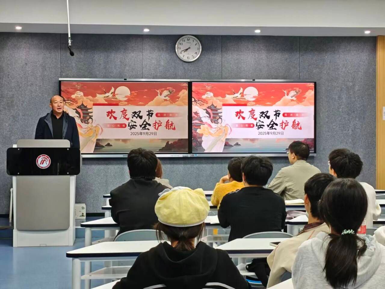 在国庆、中秋双节来临之际,澳门pg团总支举办“欢度双节、安全护航”主题团日活动。党总支书记孙保本深入学院晚自习教室,以“面对面交流、心贴心叮嘱” 的方式,为 200 余名团员青年开展 “欢度双节、安全护航” 主题团课,将安全意识和节日关怀精准送达课堂一线。