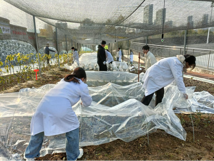 茶园管理是活动的重要组成部分。11~12月期间,学生们分组多次进行浇水、除草、施肥等日常维护工作,保障茶树水分充足。针对秋冬气温降低情况,还学习铺膜防冻技术,为茶树越冬做好防护。