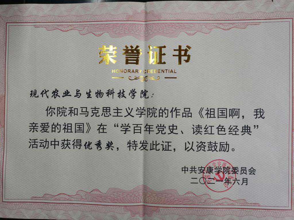 2021年6月作品《祖国啊,我亲爱的祖国》学百年党史、读红色经典获得优秀奖