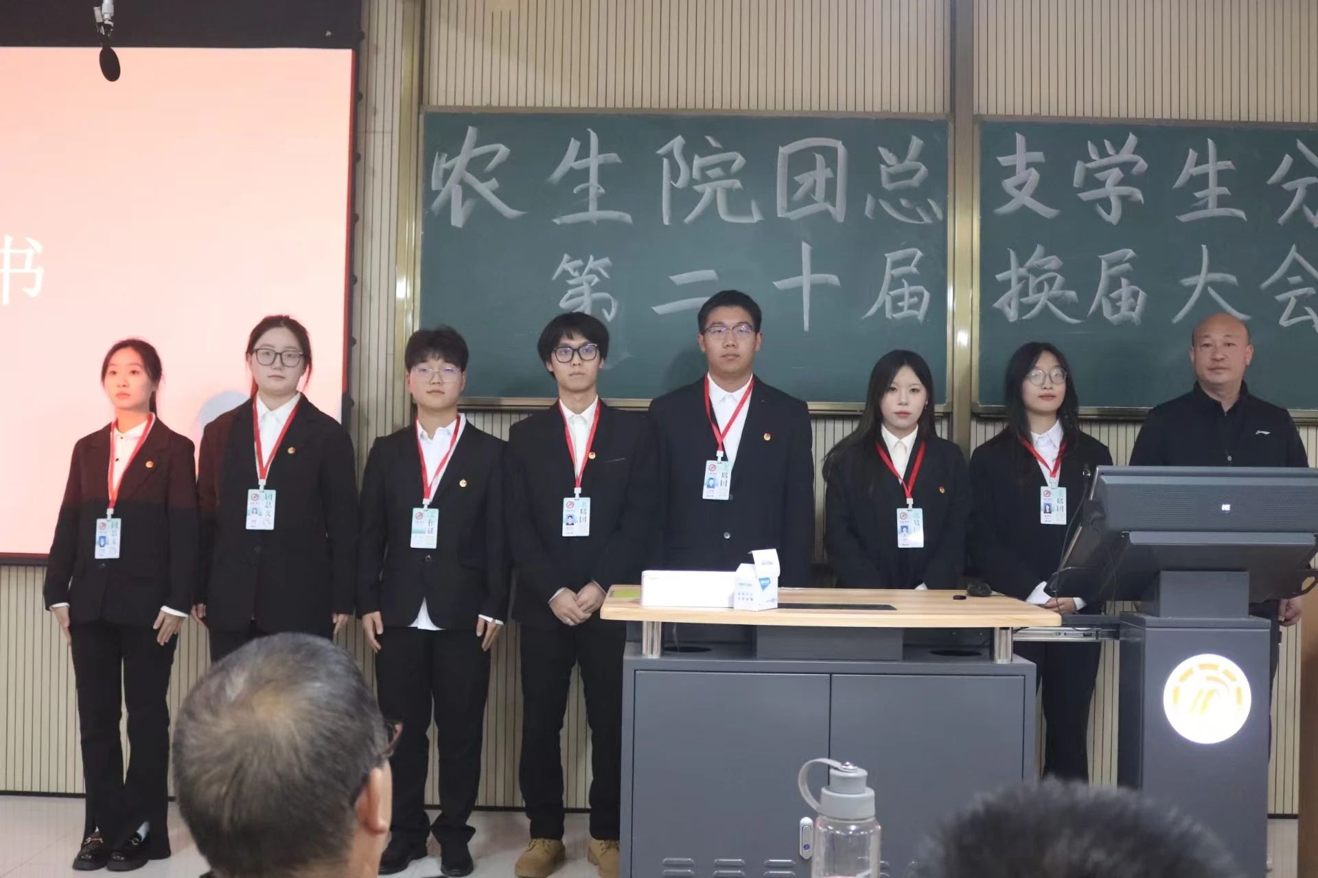 孙保本为第十九届团总支学生分会成员颁发聘书,与会学工老师为新一届团学干部颁发工作证,并合影留念。在参会师生的见证下,团总支、学生分会各部门进行庄严宣誓。
